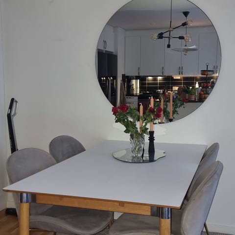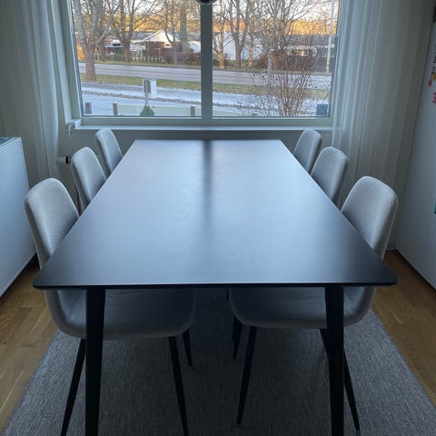 Inköpt på Folkhemmet 2016-2017 för ca 20,000. Bordet och stolar är i massivt trä, bordet är tungt.