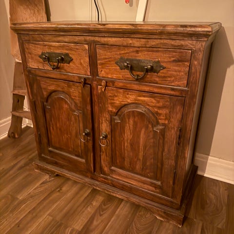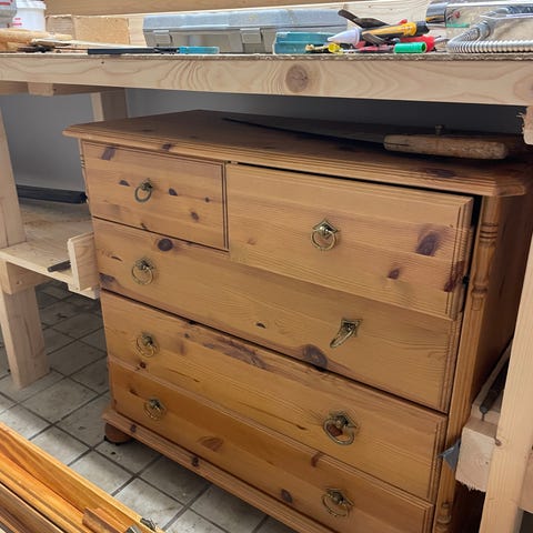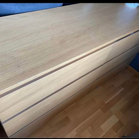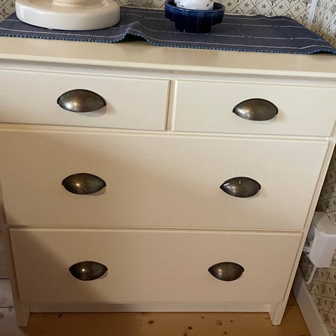 Byrån är i gott skick. Den sista lådan behöver fixas men det är inget stort som påverkar användningen alls och syns tydligt på bilden. Det kan finnas några små ytliga repor, men överlag är byrån i fint och välbevarat skick.