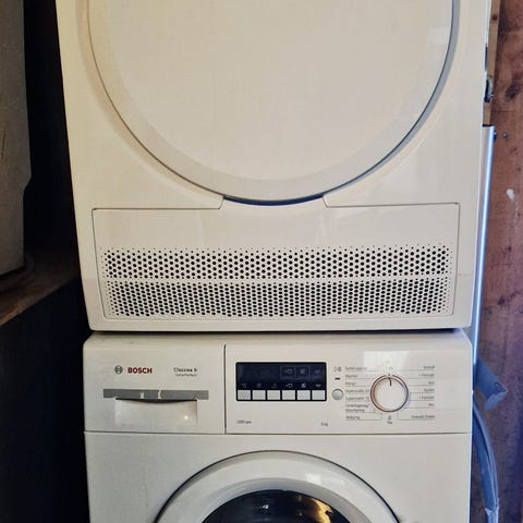 Tvättmaskin och torktumlare är staplade idag och säljs som ett komplett! Det finns även en bänk som dras in och ut mellan maskinerna.