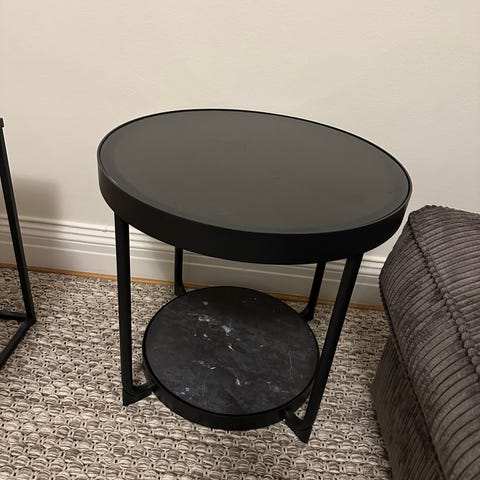 Svart soffbord med glasskiva perfekt för små vardagsrum, går att använda som sidobord om man vill.