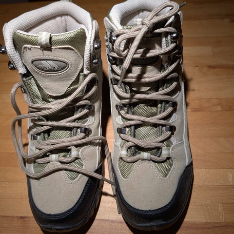 Ett par vandringsskor perfekta för utomhusaktiviteter. De har nya snören och en robust sula för bra grepp.