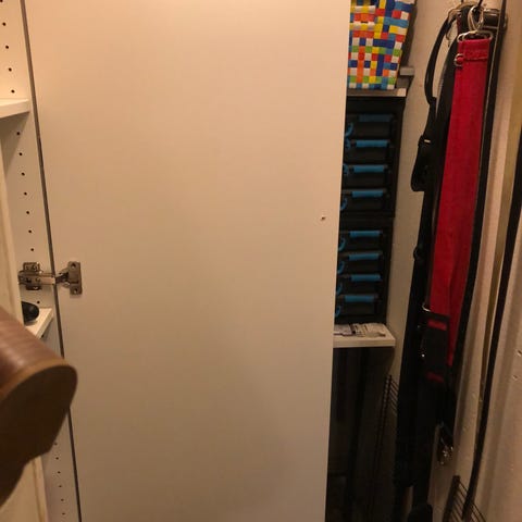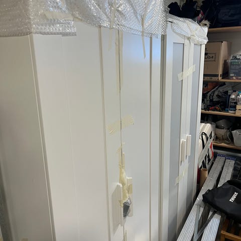 IKEA Brimnes garderob i vitt med tre dörrar, en av dörrarna har spegel. Garderoben har hyllor för förvaring och en stång för kläder. Saknar en baksockel, lite slitage på sidorna men övrigt fin och fullt funktionell.