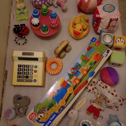 Babyleksaker och baby ”huvudskydd” (mjuk hjälm som skyddar huvudet när bebisen börjar röra sig mer).