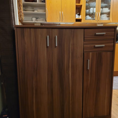 Hallbyrå med 2 hyllplan med skoutrymme, samt en övre låda för vanlig förvaring. Säljs för 500 kr.