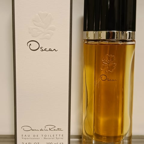 Oscar de la Renta Eau de Toilette i sprayform med en volym på 90 ml, ca 45 % kvar. Produkten är tillverkad i Frankrike och innehåller 84,6 volymprocent alkohol.