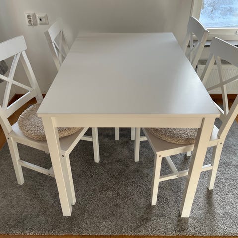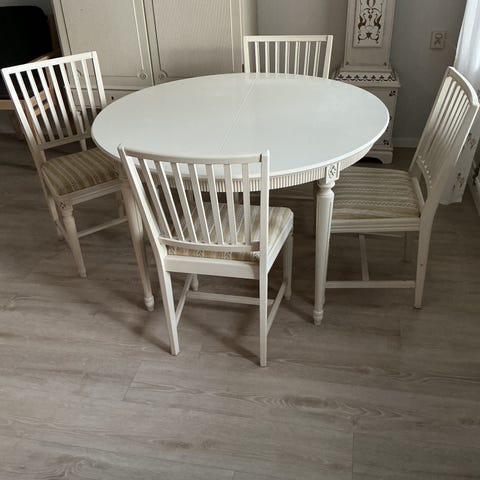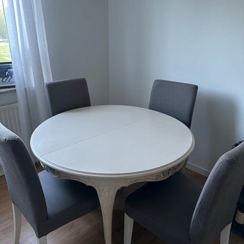 runt vitt bord med fyra stolar (k,ädsel avtagbart för tvätt)