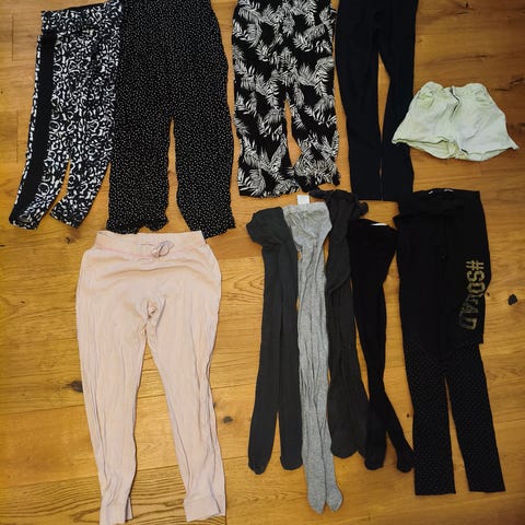 49 st barnkläder/flickplagg i storlek 134/140 inklusive byxor, t-shirts, långärmade tunna tröjor, långärmade tjocka tröjor, shorts, träningskläder, klänningar, arbetsbyxor/trädgårdshängselbyxor, hängselshorts, jumpsuit, tunn vindjacka/skaljacka, fodrad tunn jacka (tyget längst ner mot händerna är lite upprepat men går att snygga till genom att klippa bort).