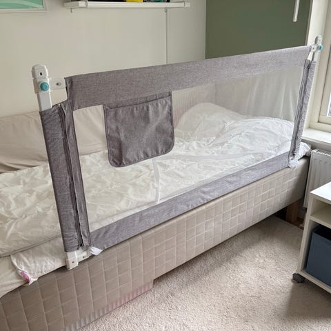 sängskydd för barn med längd 200 cm och höjdjustering från 70 till 98 cm. Sängskyddet är grått, tillverkat i mjukt och slitstarkt material och har ett böjt designrör för bättre passform mot madrassen. Sänggaller, 200 cm, justerbar höjd 70-98 cm, babygaller för småbarn, fallskydd för barn med mönster, sängspår stabil konstruktion, barnsängsskydd med luftigt nät, grå