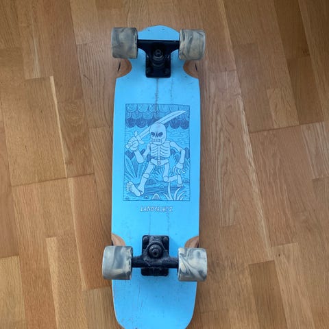 Zero skateboard med svart däck och skallemotiv. Skateboarden har hjul och trucks monterade, anpassad för skateboarding. Kan hämtas i Linköping