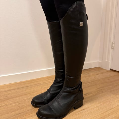 Ridstövlar junior i svart läder från CRW i storlek 35. Dragkedja bak. Använda men fortfarande gott skick.