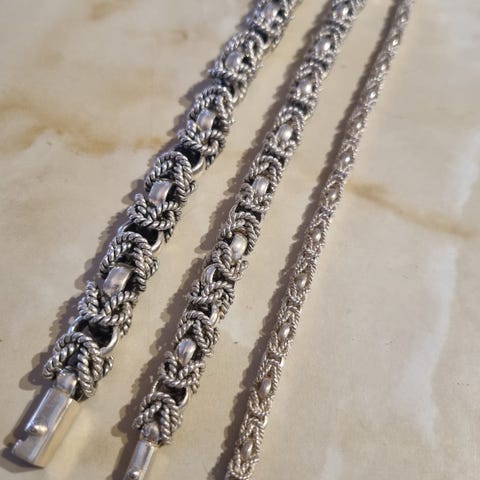 Handgjorda smycken med släta ringar med flätade trådar. Väldigt ovanligt att sådan här verk kommer ut till försäljning.