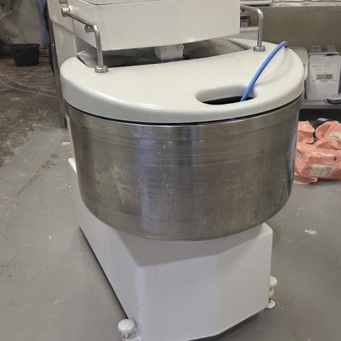 Industriell köksmaskin utrustad med rostfri bunke, avsedd för blandning och bearbetning av livsmedel. Maskinen har ett robust utförande och är lämplig för professionell användning i kök och bagerier.