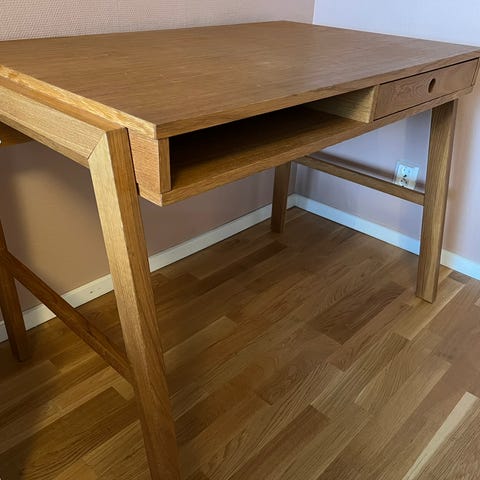 Fint oljat skrivbord i massiv ek inköpt på designbutiken R.O.O.M i början av 2000-talet. Inköpspriset var runt 7500 kronor. Två lådor med borstade handtag.