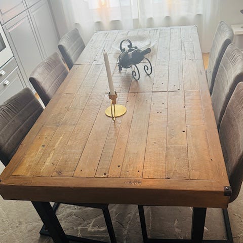 Matbord från Mio 180 cm långt till 240 med iläggskiva. Jättebra och stabilt matbord med plats för många, superlätt att förlänga upp till 240cm med inbyggd iläggsskiva som snabbt fälls upp. Bordet har naturlig patina och naturligt rustik finish. Finns spår av lite glitter och stearin på ytan, borde inte vara svårt att få bort.
