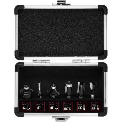 Set med 12 olika överfrässtål av hög kvalitet, perfekt för både hobby och snickeri. Stålen levereras i en snygg och robust aluminiumväska med skuminsats som skyddar verktygen.
