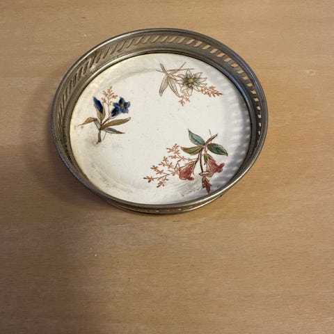 Vintage / art deco bordssurtout i sex delar, bestående av fat i silvermetall samt löstagbara dekorativa fasettslipade glas behållare.