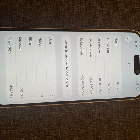 iPhone 14 Pro 512 GB i bra skick det finns någon liten repa som blir vid användning. Men så pass liten att det är svårt att få med på bild.