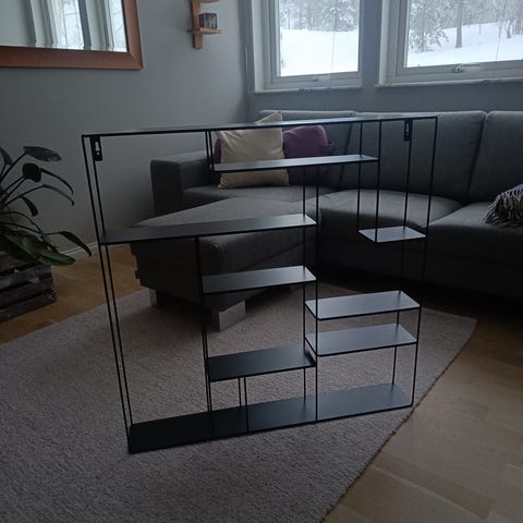 Snygg, svart hylla i pulverlackerad metall. Inköpt på Nordiska hem i Danderyd.