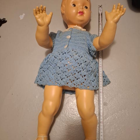 Dockan är ca 30 cm, minst 60 år gammal. Klädd i liknande leksandsdräkt. Kan blunda och säga mamma. Väldigt väl bevarad, bara en liten skada på foten. Se bild