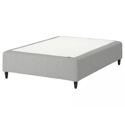 Jysk säng med svart tygklädsel och metallben