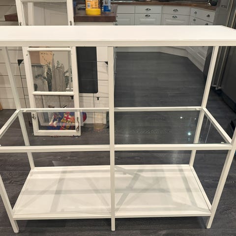 Praktisk modulhylla i tre delar med vitrindel. Kan placeras ihop som helhet eller stå var för sig.