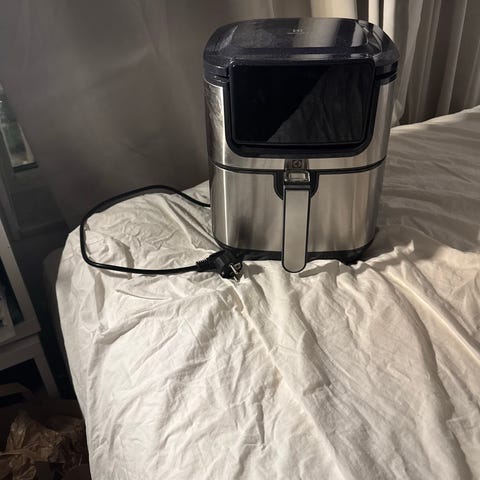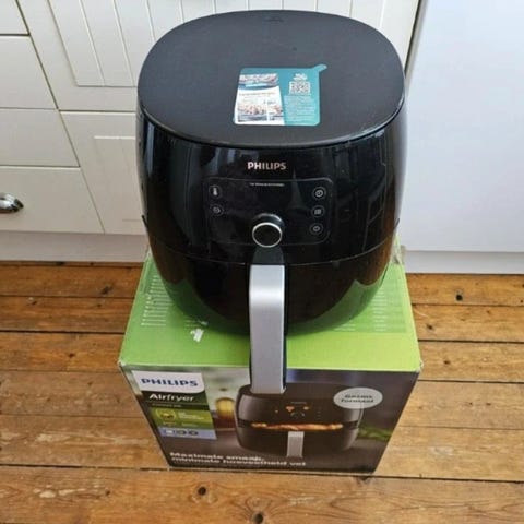 Centurion Airfryer med digital display och temperaturkontroll. Svart färg med handtag och perforerad korg för luftfritering. Passar för tillagning av olika typer av mat med varmluftsteknik. Fungerar felfritt och i mycket bra skick.