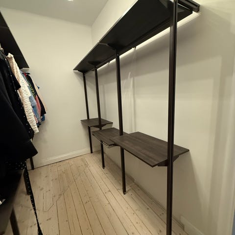 Säljer denna fina förvaringsmöbel. Perfekt i hallen, öppen garderob. Enkel och stilren i mörkbetsad fanér. 3 st hyllplan, klädstång och en hurts / byrå med mässingsbeslag.