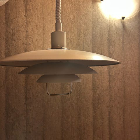 En stilren och modern taklampa med vit utsida och kopparfärgad insida som ger ett varmt och behagligt ljus. Passar perfekt över matbord, i vardagsrum eller sovrum.
