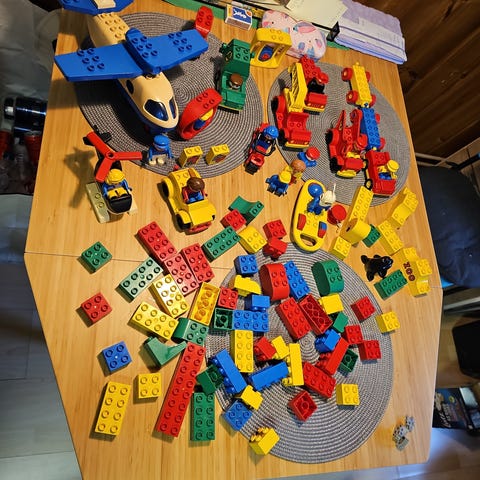 Fint duplo säljes. Fordon (tex flygplan, polisbil och lastbil), gubbar, djur, byggklossar (med bokstäver och vanliga) och grön basplatta.