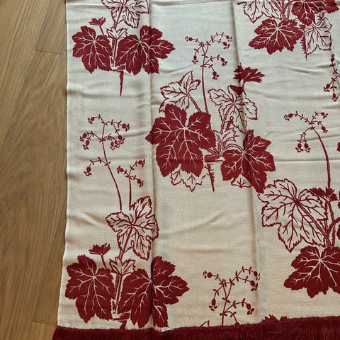 Bomullstyg i grått/rött/senapsgult/vitt mönster med fint fall.