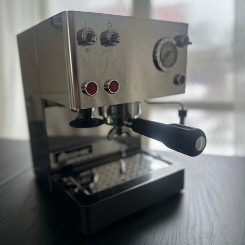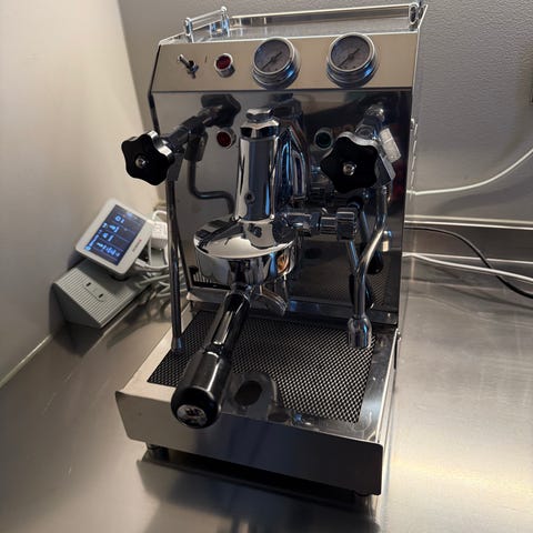 Isomac espressomaskin i svart. Utrustad med tryckmätare och två portafilter.