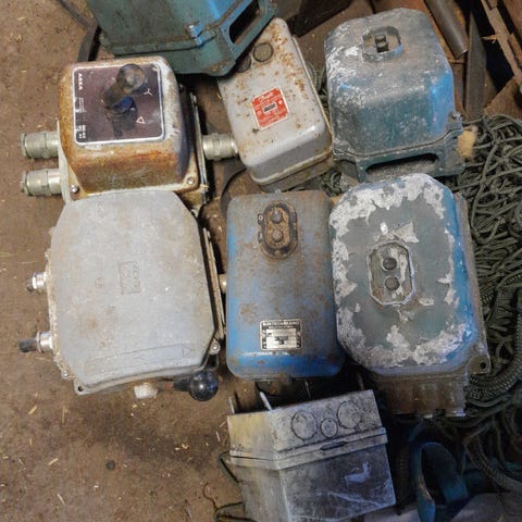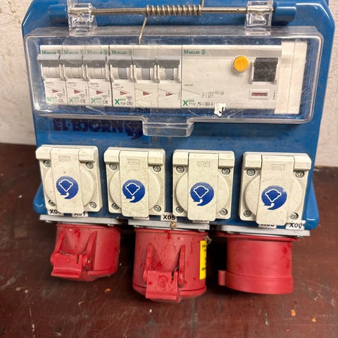 Elcentral U32 för exempelvis byggström. Inkommande trefas 32A handske. Utgående 1x32A, 3x16A plus 6st vanliga enfas uttag. Försedd med två jordfelsbrytare och dvärgbrytare. Fullt fungerande central. Mycket praktisk att ha under byggtiden.