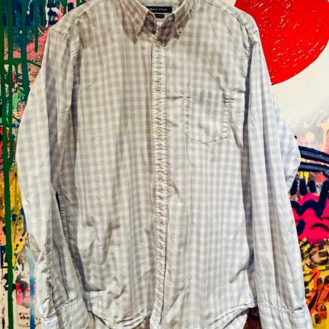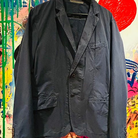 Blå V-ringad tröja med långa ärmar. Tröjan har en broderad detalj nedtill på vänster sida.1 hål på högerärmen och 2 hål på tröjans framsida(se bilder).