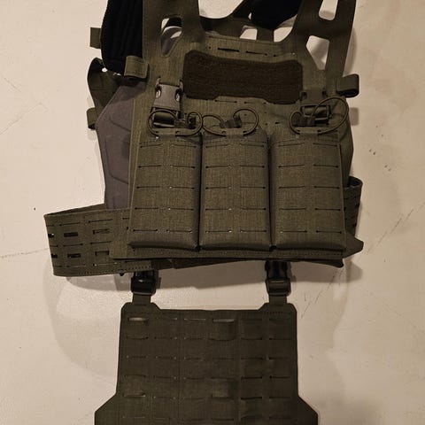 Tjena, säljer nu en av mina helt nya Agilite inspirerade plate carriers med Quick Release (QR) gjort utav 500D Nylon då jag har alldeles för många. Kommer komplett med 2st 25x30cm (10x12in) NIJ IV plattor gjort utav PE/Alumina med Polyurea coating som gör dom vattentäta. Märke på plattorna e NordHaven och klarar allt från pistolskott ända upp till .30-06 M2AP (Armour piercing). Man kan enkelt ändra och lägga till saker på plate carriern (se sista bild som exempel). Funkar utmärkt till att spela airsoft, war prepping, jakt elr liknande.