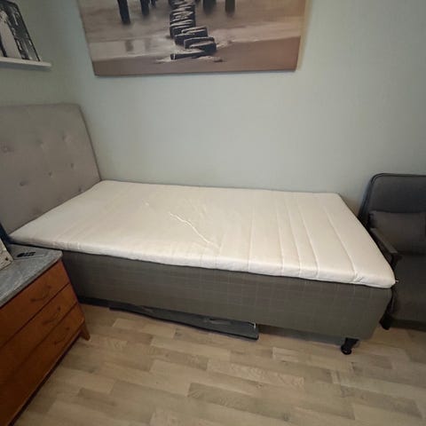 En säng som är 105x200 . Finns märke av att en katt har bitit på den och de finns djur i hemmet.