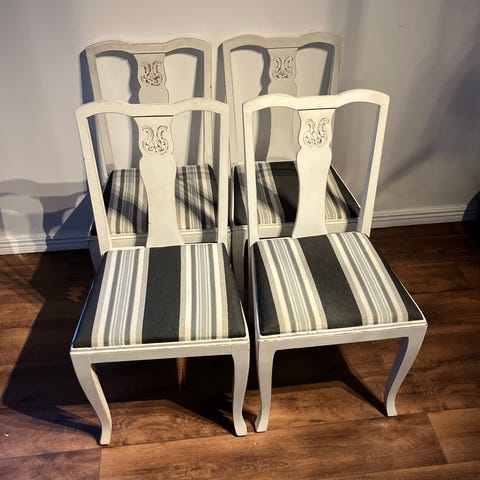 6 stadiga stolar. Behöver målas, bytas sits men i övrigt helt ok. Det var ett (ytterligare) renoveringsprojekt som inte blev av 😅