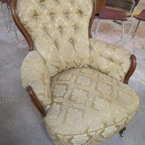 Soffa + 2 karmstolar + 5 stolar + bord.