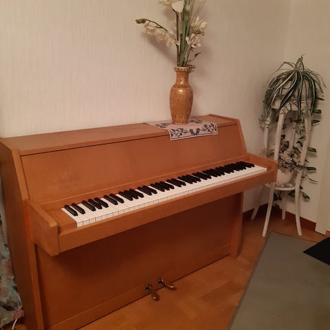 Ett upprättstående piano i brun träfinish. Pianot har standardtangenter och tre pedaler. Passar för musikövning och framträdanden i hemmiljö eller mindre utrymmen.