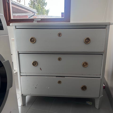 Söker du en möbel med unik karaktär och tidlös känsla? Här säljes en mycket vacker och nätt byrå som har förädlats med vit kalkfärg för att få den rätta, matta finishen. Byrån kombinerar en klassisk, vågformad front med dekorativa beslag i antik mässingslook, vilket ger den en genuin vintage-känsla som passar perfekt i både det moderna och det lantliga hemmet.