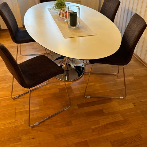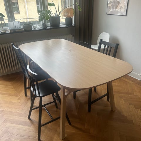 Hej, säljer superellips med kluvna ben inför flytt. Det är av formen C med storleken 150 x 90 cm. Bordet är aldrig tidigare slipat så det finns gott mått med fanér, med det sagt så finns det en del skavanker i bordsytan.