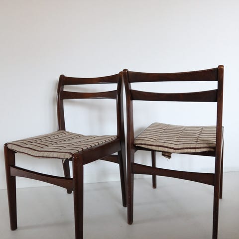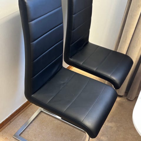 4st matstolar i äkta läder och gediget stål. Otroligt sköna och beständiga. De är använda och har patina. På några väldigt få ställen finns det lite färg från tidigare ägare. I övrigt inga som helst fel på stolarna.