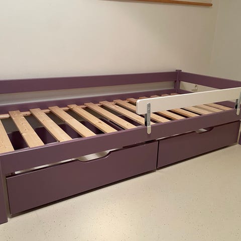 Två förvaringslådor ingår det är lådorna som använts mest och därför har mest bruksspår. Själva sängen är i gott skick.