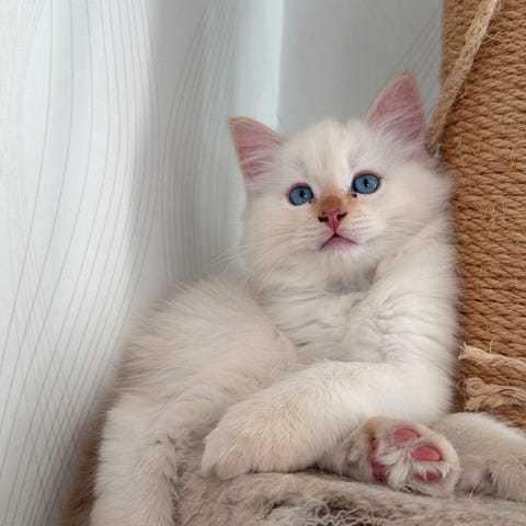 Två underbara kattungar ( honor ) med vacker vit päls. Pappan är ragdoll med stamtavla och mamman brittiska korthårig med stamtavla .