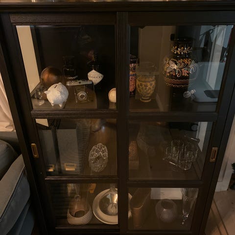 Sideboard i svart trä. Skjutdörrar i glas och ett hyllplan i glas på varje sida. Några diskreta smårepor på ovansidan.