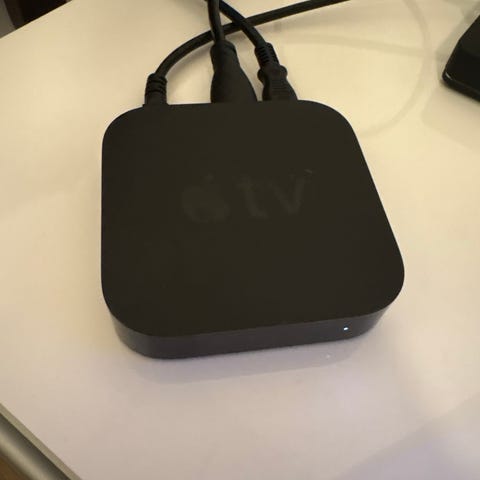 2st a 1469 Apple TV med fjärrkontroll. Enheten är svart och används för att strömma media och applikationer till en TV. Inkluderar kablar för anslutning.