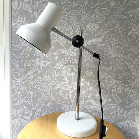 Vintage bordslampa i metall, i snygg grön färg. Med bordsfäste. Reglerbar höjd, vinkel på både arm och kupa, mm. Väldigt praktisk. Bra skick med mindre bruks-/åldersslitage enligt bilder. Fungerar bra.