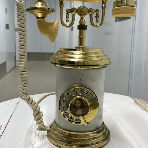 Bordstelefon i mässing och marmor.