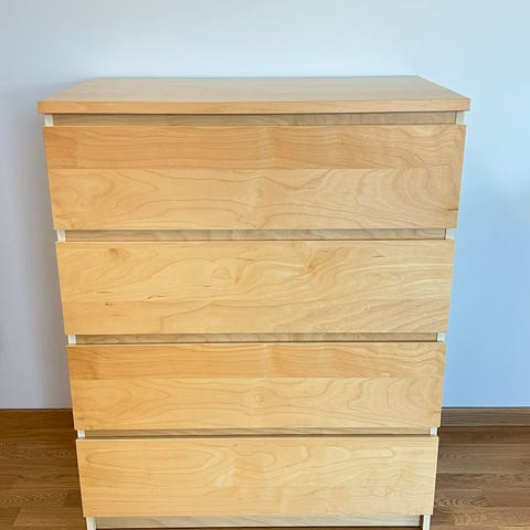 IKEA Malm byrå med fyra lådor i svart färg. Byrån är tillverkad av trä och erbjuder förvaringsutrymme för olika typer av kläder eller föremål. Passar för användning i sovrum eller andra rum där extra förvaring behövs. Toppskivan något skadad/nött vid en tidigare flytt men inget som märks av vid användning. Rymlig för mycket förvaring.