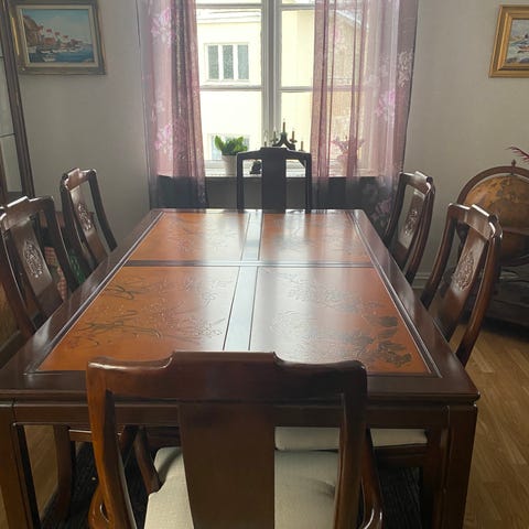 Träbord med iläggsskiva, rundad form och fyra fina svarvade ben. Bordet är av ljust trä och har en yta som visar viss användning. Passar som matbord eller arbetsbord i hem eller mindre utrymmen. Iläggsskivan som följer med gör det möjligt för 3 personer att sitta per sida. Har legat en duk på skivan för att skydda den men går lätt att putsa och olja/lacka om till nysckik.