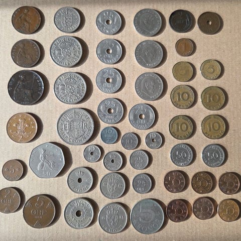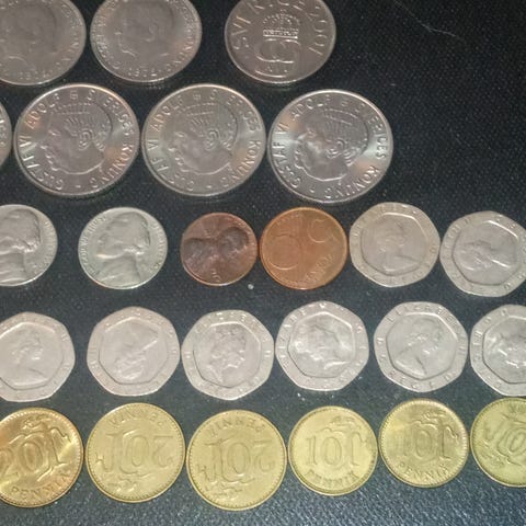 Samling av mynt i olika valörer och material. Innehåller mynt i varierande storlekar och färger, inklusive silverfärgade, guldfärgade och kopparfärgade mynt. Passar för samlare eller som referensmaterial.